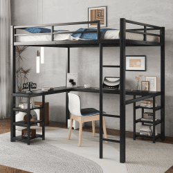 Full Size Loft Metal&MDF Bed With Desk And Shelf, Black