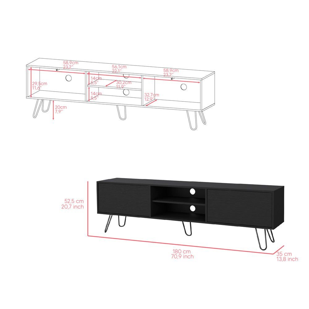 The "Franklin TV Stand" combines functionality with modern style. Its black manufactured wood finish suits any living room decor. The stand features two enclosed spaces (23.2"W X 11.6"H X 12.9"D) and two open shelves (22.1"W X 5.5"H X 11.9"D), supported by five sturdy legs. Perfect for keeping media devices and accessories organized.Dimensions: Height: 20,7'Width: 70,9' Depth: 13,8'Furniture Type: Ready to assemble (full assembly required).Certifications: CARB phase II compliant – TSCA Title VI Compliant.Warranty: 1-year warranty coverage in wooden parts- 1-year warranty coverage in hardware pieces since its manufacturing date is found in the lot number printed in the product box.Shipment details: Free shipping to the 48 contiguous states - delivery time: Between 2 and 5 days, depending on the customer's location, season, and weather factors.Other details: This product does not include decorative or background elements; Check that the box is in good condition and well packed and check with the help of the manual that the corresponding parts have been included; For more information regarding warranty, shipment details, cancellations, returns & replacement parts go to the bottom section of our website to learn more; Installation & Assembly Instructions included.